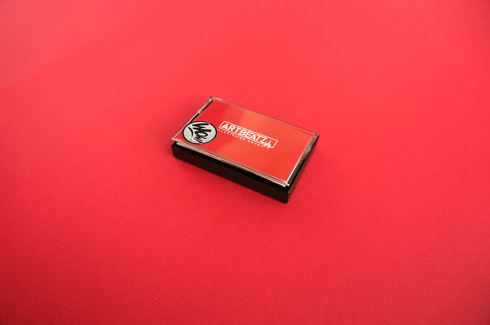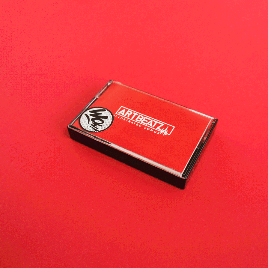 Inside is a folded flyer that contains all the important info about the project. The illustrated workflow gives a small insight into the work from song to shirt. There is also a small "Paint It Black" sticker that can be taken out of the flyer. When it's folded it fits in a cassette sleeve and complements the business card in tape-look. Fun Fact: all flyers were folded by hand by the ARTBEATZ crew members. The promo package also contains the catalogue "MUSIC IS OUR FASHION", which comes in the form of a vinyl cover. It contains all ARTBEATZ illustrations, including the text passages that served as inspiration. On top of that, there are postcards of the current designs and the "Schwarzmaler" (black painter) as a sticker. A really fresh package, strictly limited of course.